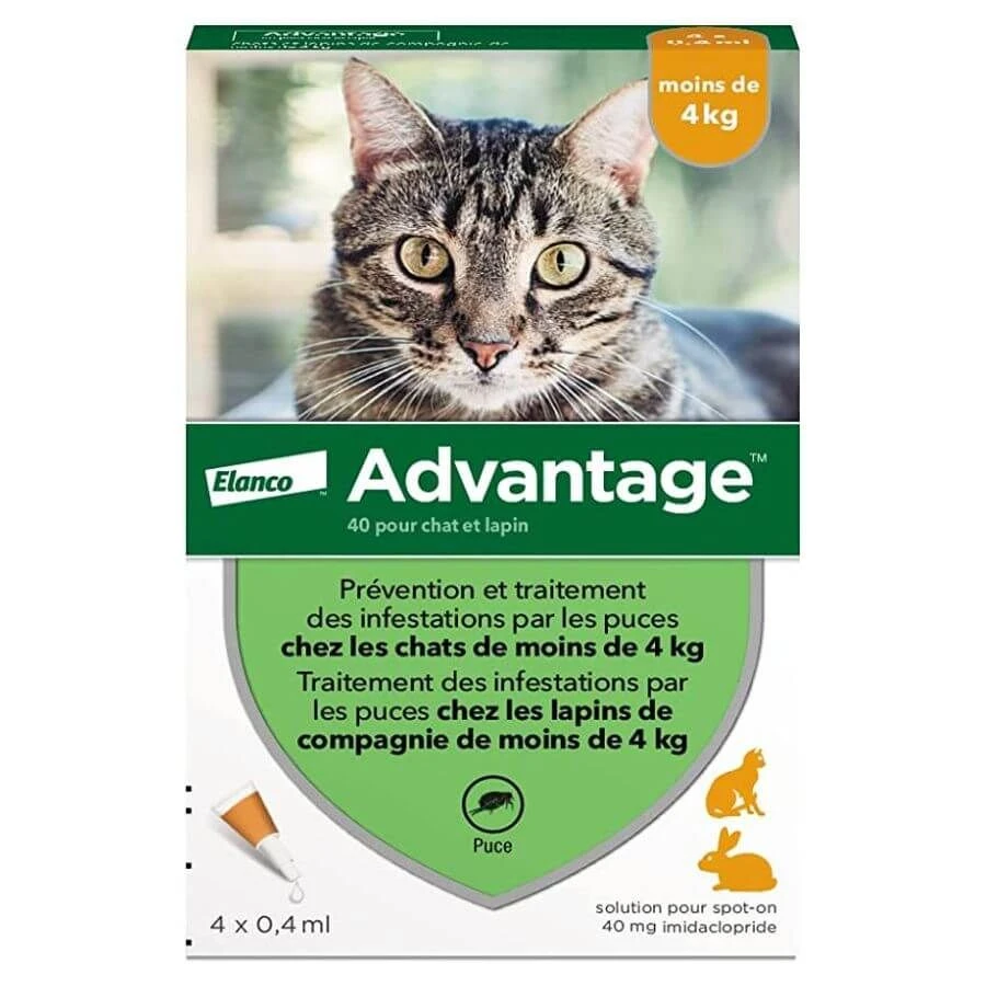 Advantage 40 prévient et traite votre chat ou votre lapin de moins de 4 kg contre les puces.