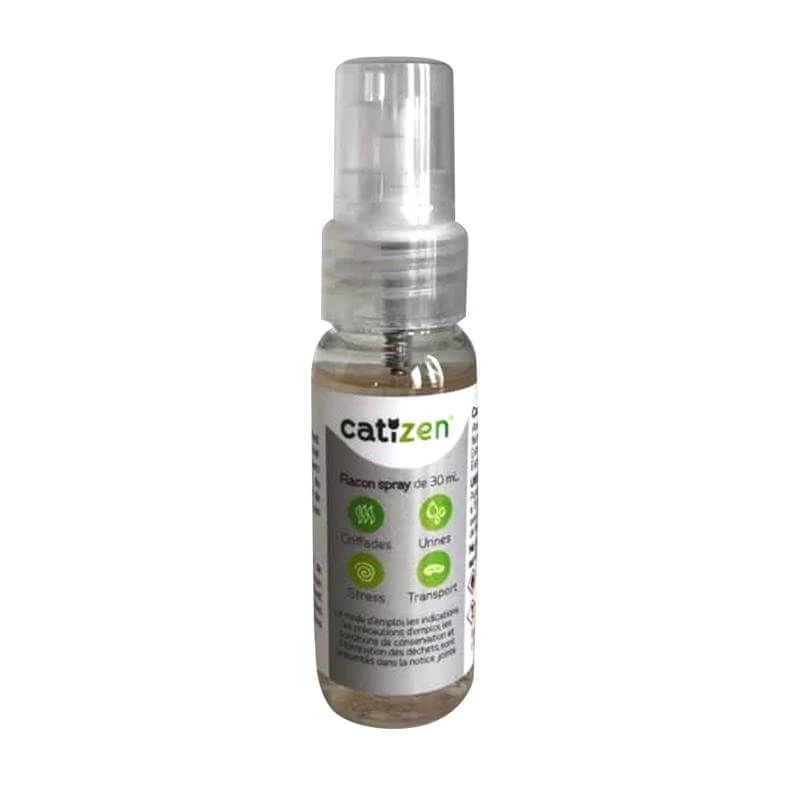 Le spray Catizen est à base de phéromone aux propriétés apaisantes permettant de réduire l’anxiété de votre chat ou votre chaton stressé face à nouvel environnement (nouvelle maison, arrivée d’un nouveau membre dans la famille). Ce spray permet également de résoudre certains problèmes de comportement (marquage urinaire, griffades,…). La double action des phéromones (dont la Fraction F3) de la Valériane envoie un signal d’apaisement à votre chat et améliore son bien-être.