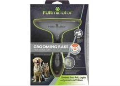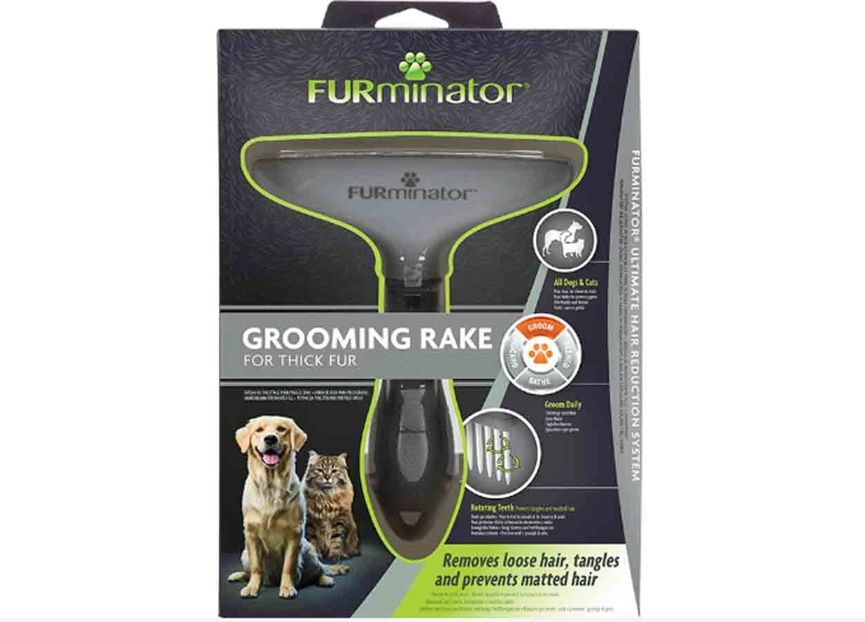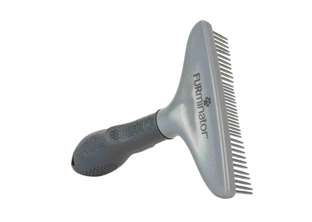 Le râteau de toilettage de Furminator pour les animaux de compagnie au pelage épais démêle le pelage, élimine les poils morts et prévient la formation de nœuds.