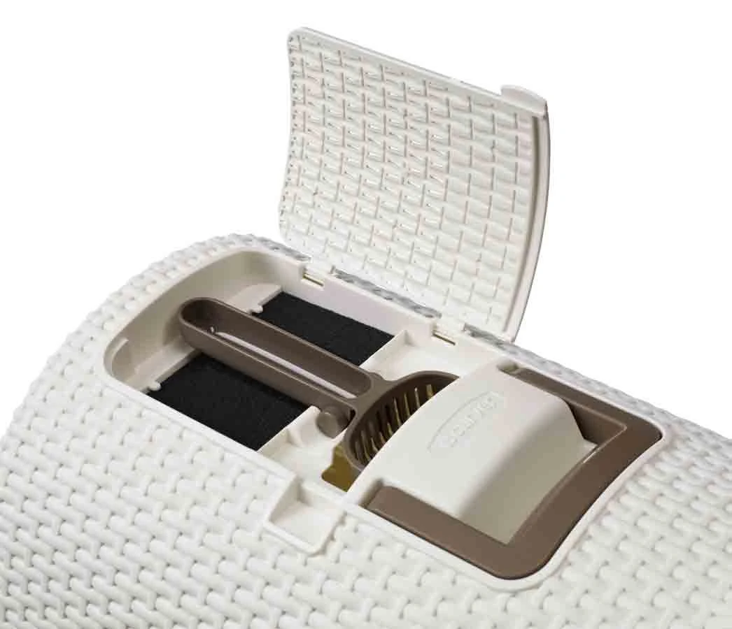 La maison de toilette pour chat Curver en motif rotin breveté est composée d’un tapis nettoyant, d’un filtre anti-odeur, d’une pelle et d’un bac extensible pour nettoyer et vider la litière.