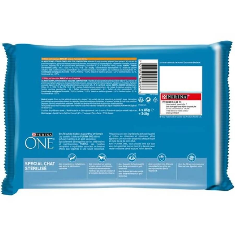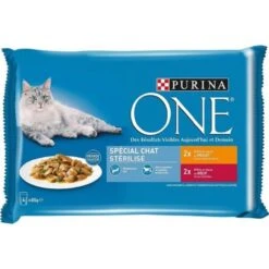 Les sachets fraîcheurs Purina One au boeuf et au poulet offrent une alimentation complète et équilibrée pour les chats adultes stérilisés.