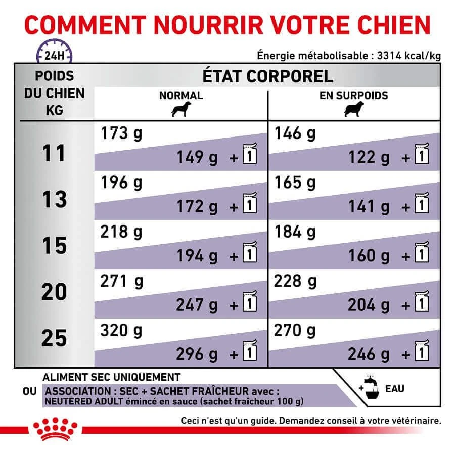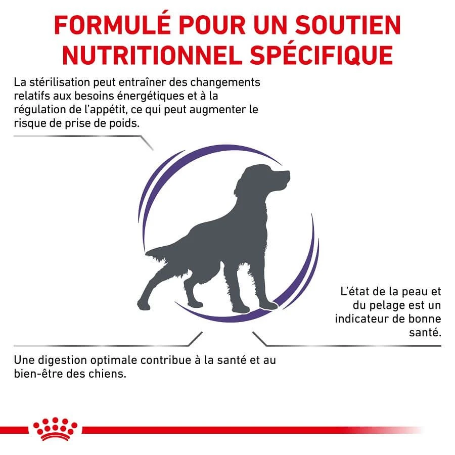 Les croquettes Royal Canin Vet Care spécifiques aux chiens stérilisés ont pour cible :